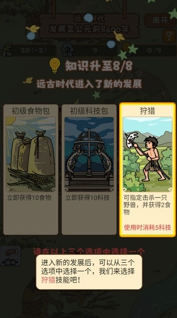 当我们的知识满足条件时,就能触发降临机制,届时可以从科技、食物和技能这三个选项里任选其一。而一旦解锁了狩猎功能,我们就具备击杀野兽的能力了。