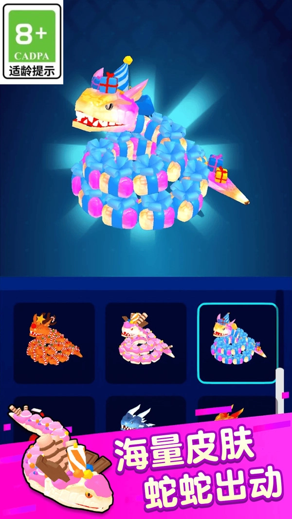 游戏里的贪吃蛇模样十分讨人喜欢,外观丰富多样,玩家也能够自行设置它们的皮肤。