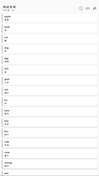 我的单词本是一款专为英语学习者设计的超轻便单词记忆游戏。它能帮助用户高效记忆单词,还配备了功能强大的单词本编辑器,用户可根据自身需求自由定制词库。游戏包含随机抽查、快速阅读等多种练习模式,通过中英互译、选择题等互动方式,让背单词变得轻松有趣,不再枯燥,助力用户逐步夯实英语基础。