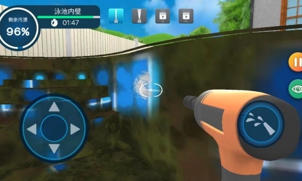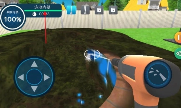 2、借助虚拟摇杆调整水枪的喷射角度,对准污渍区域精准冲洗,依据任务提示一步步达成清洁目标。