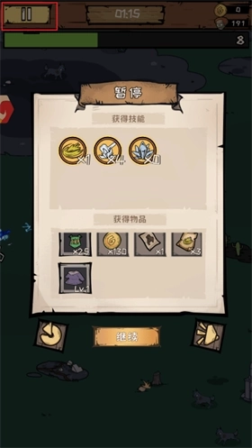 2、点击暂停键可以查看已获取的技能与奖励,在抵挡了无数波怪物的攻击后,我们终于赢得了胜利。