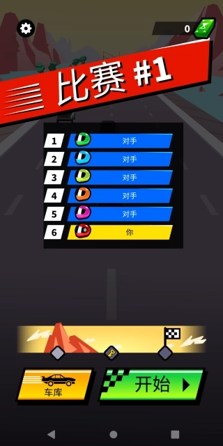 1.进入游戏主界面后,点击“开始”按钮就能直接开启竞速闯关挑战;若点击“车库”,则可以更换不同的汽车。
