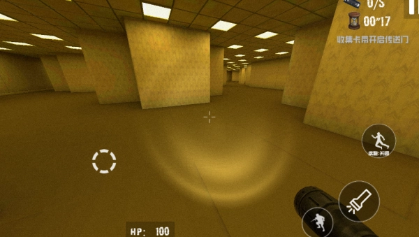 3、选定“逃离后室”模式后,你会进入昏暗的密室环境,此时需要手持武器来躲避木棍人的追击。
