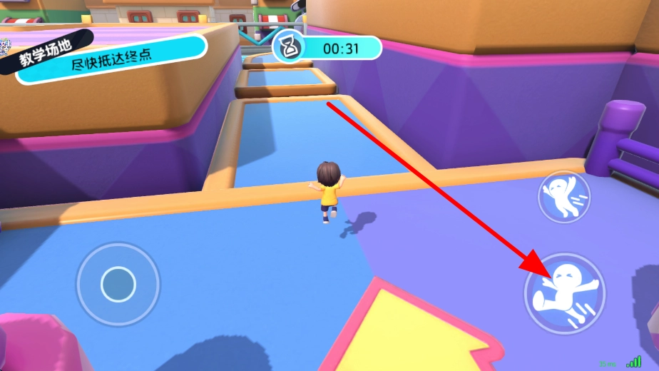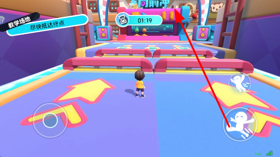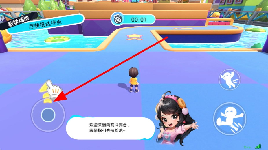 接着进入教学场地等关卡,操控角色移动,可通过界面上的移动按钮,控制角色在关卡场景中前进,朝着终点方向移动。