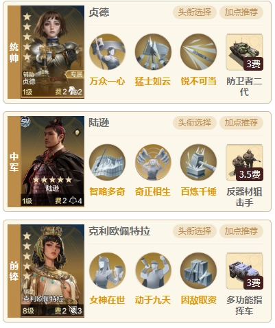 在第四纪元,陆逊主动队的出场率已经不低,也算是当时的热门阵容之一,不过搭配克利欧佩特拉的情况相对少见。这套配置里加入克利欧佩特拉,既能满足“猛士如云”对三个兵种的需求,还能带来一定的增伤与减伤效果。“统帅三军”和“兵精将广”这两个buff虽说强度都很高,但并不适配这个阵容——毕竟这套阵容的核心思路,是靠陆逊的超高伤害抢占先手,快速压低敌方兵力;哪怕前1-2回合没法直接完成击杀,也能打掉对手大部分兵力。