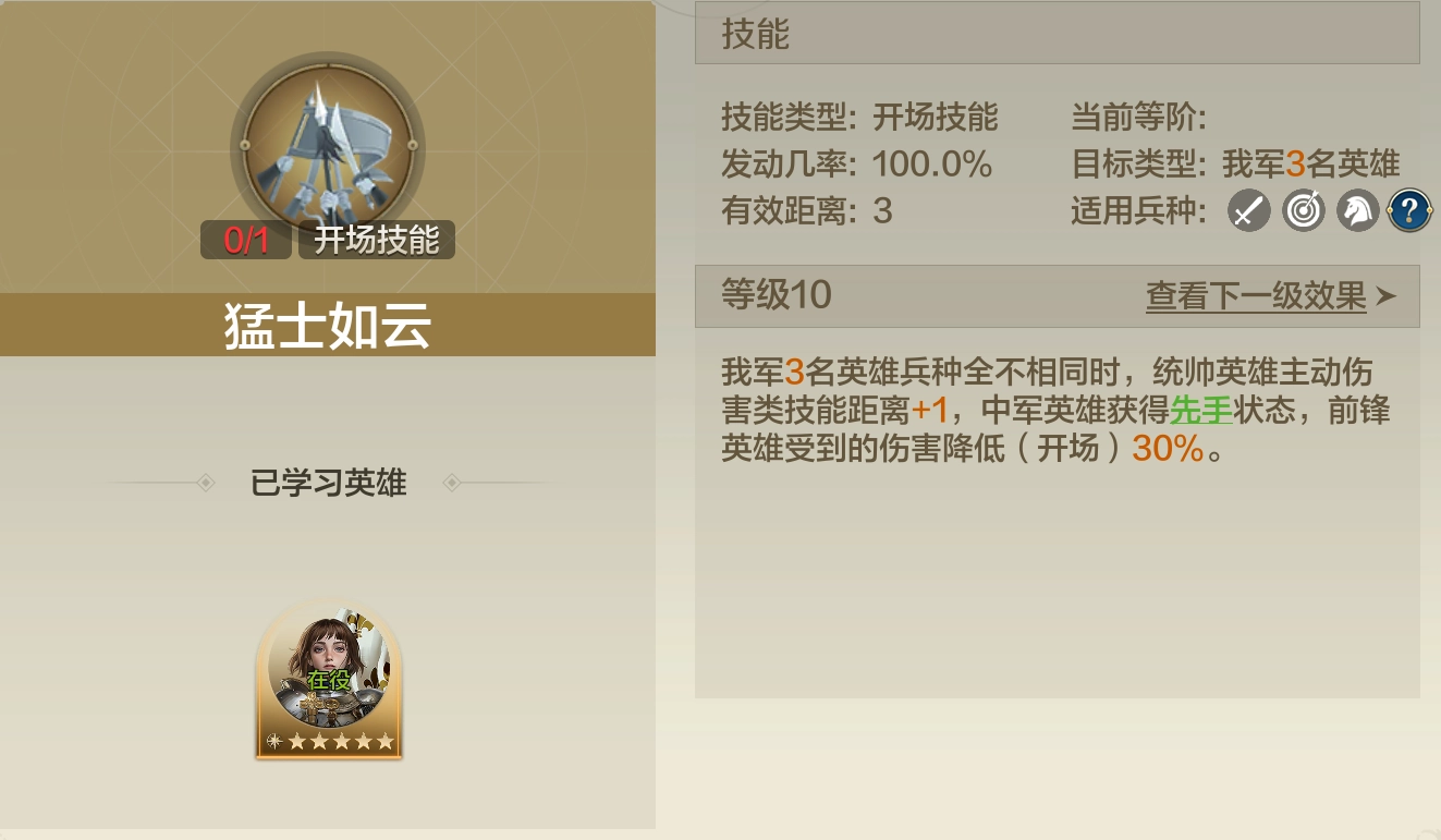 璀璨技能“猛士如云”可通过克里斯蒂娜、亚历山大、马克·安东尼兑换获取,在璀璨技能里属于相对容易获得的类型。其技能效果与“勇冠三军”“兵精将广”相似,要求三名英雄携带的兵种各不相同。不少人或许会认为“统帅主动伤害技能+1”这一效果没太大用处,毕竟主动伤害技能的有效距离普遍不低,中军获得先手更适合秦始皇这类开场就能进行先手控制的英雄,而前锋“受到的伤害降低”这一效果则比较实用。