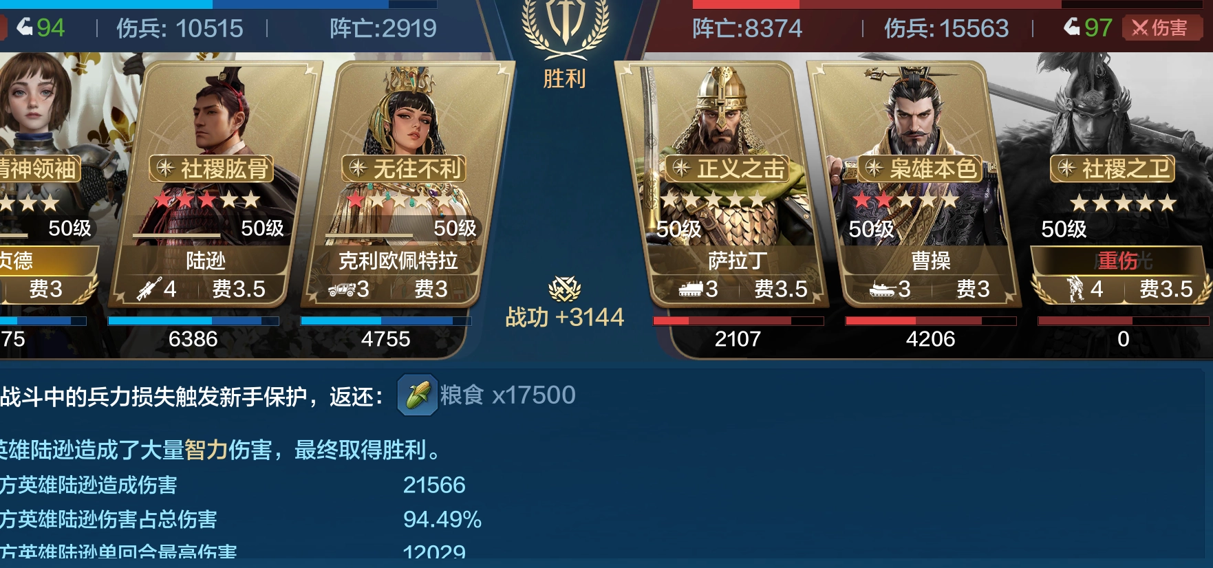 克利欧佩特拉搭配了动于九天和因敌取资两个技能,其中动于九天能强化队伍前三回合的爆发能力,不过决水千仞会和她的自带技能产生冲突。而因敌取资则可以与陆逊的大头衔相配合,为整个队伍补充一定的恢复续航效果。