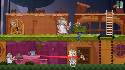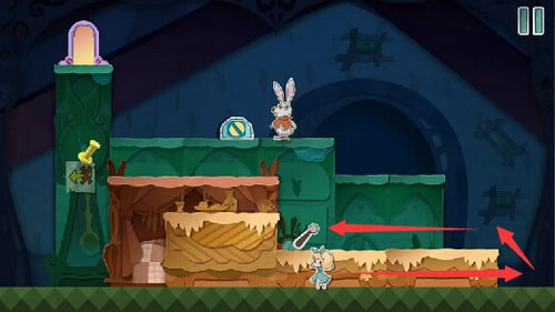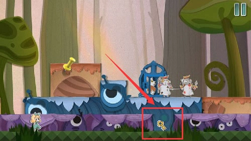8、等巡逻兵移动到右侧位置时,把蓝色方块向左拖动就能将它隔离开,之后用钥匙打开门救出老鼠,就能顺利通过这一关了。