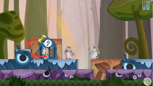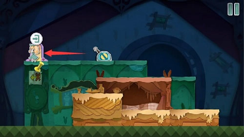 7、把红色方块向右拖动来铺设路径,接着沿着铺好的路爬到顶部安装拉杆,使传送门下降。