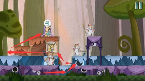 1、按照下图所示移动方块,把扑克兵卡在屏幕的另一侧,接着拉下操纵杆,打开时钟塔的门。
