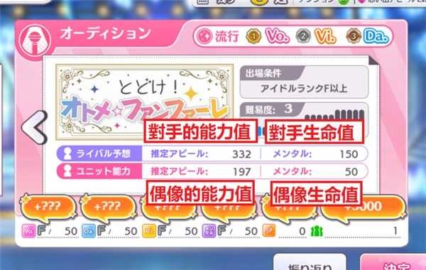 试镜本质是一场三方评审博弈。左屏三位评审分别代表Vocal、Dance、Visual属性,其满意度随当周流行趋势浮动——最热属性奖励翻倍,次热属性加成1.5倍。玩家需精准释放Appeal技能,填满评审满意度条以获得星星,排名前两位者全员合格。