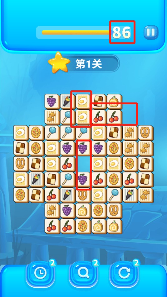 2、在关卡里,你需要点击两个相同的食品来完成消除操作,建议先点击距离近的,再去消除距离远的。